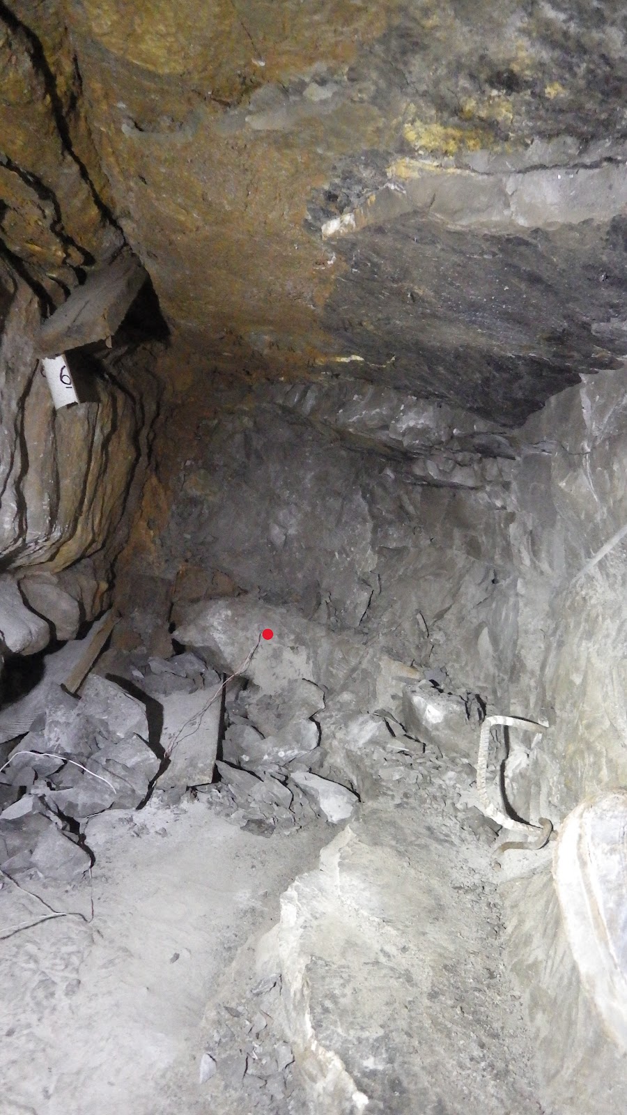 Côté gauche : les strates intactes. Gros bloc décollé de la paroi droite et faisant de la résistance. Planches pour éviter au maximum la chute plus basse des gravats.