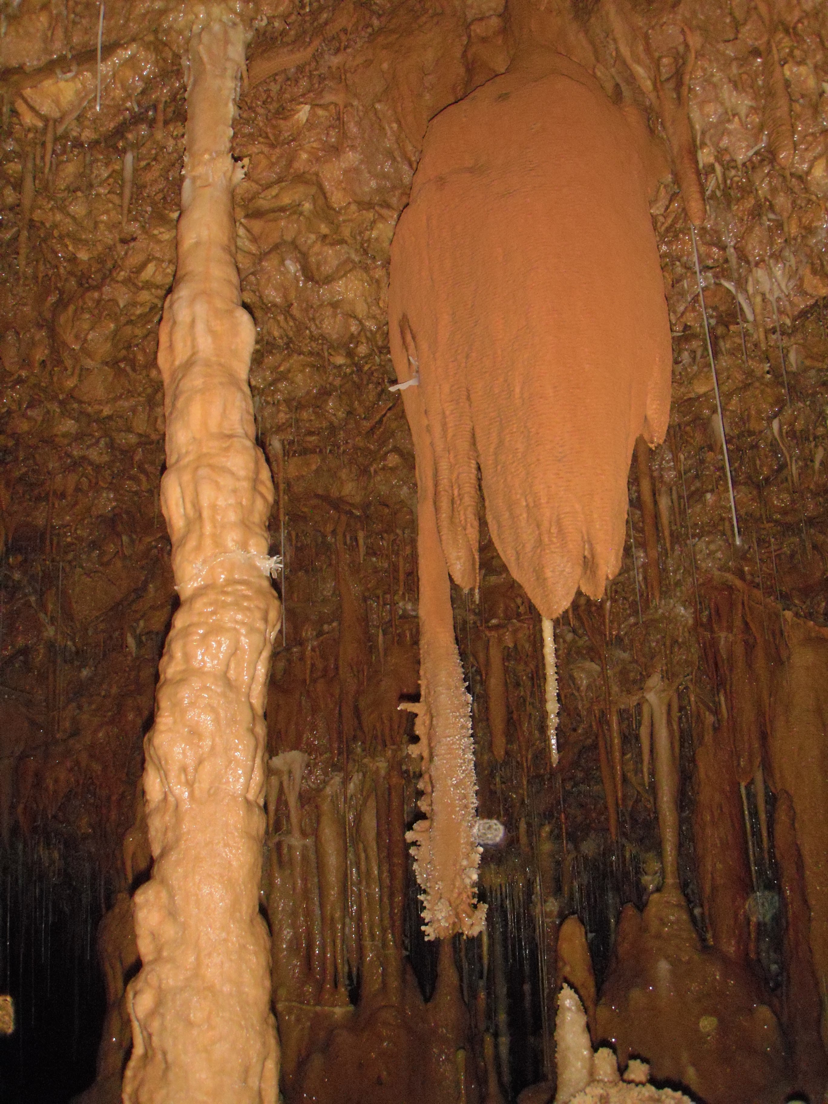 Ou d'autres où il semblerait que la stalactite a d'abord évité la rencontre avec la stalagmite puis à force de s'épaissir l'une l'autre et sous la pression mutuelle en a fait céder une (la stalactite).